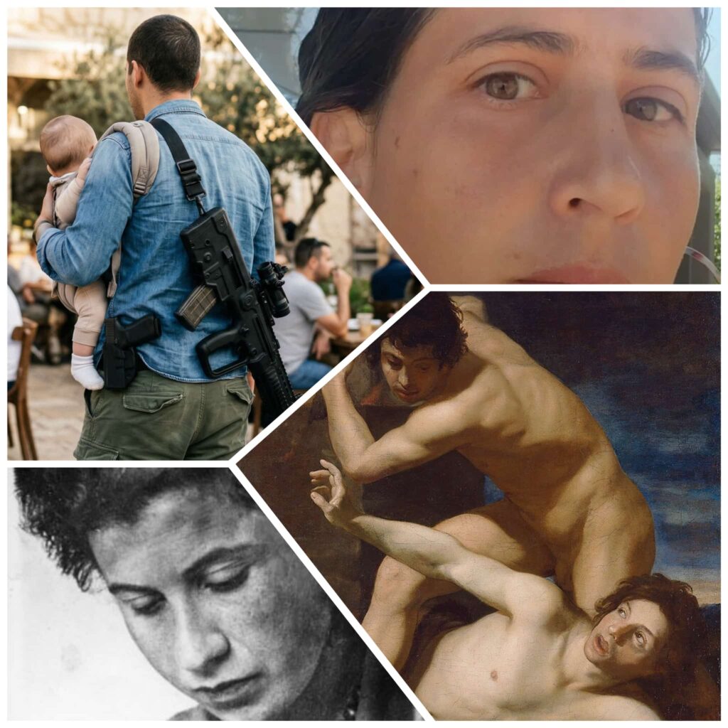 אבא לתינוקת, עם נשק על גבו ובמותניו, היה הטריגר שלי לכתיבת המאמר. מעבר לדוגמאות של שושנה סטרוק, יעל פוליאקוב והפורעים ביהודה ושומרון, נעזרתי גם בחוקרים ג'ודית לואיס הרמן וג'וזף קמפבל, מיתוסים עתיקים על קין ולמך, ודמויות מופת כמו אתי הילסום.